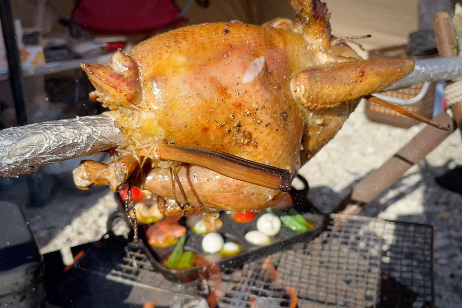 自作したチェアに座り、ワイルドな料理を楽しむかほなん。スウェーデントーチやトライポッドの作り方も紹介している。