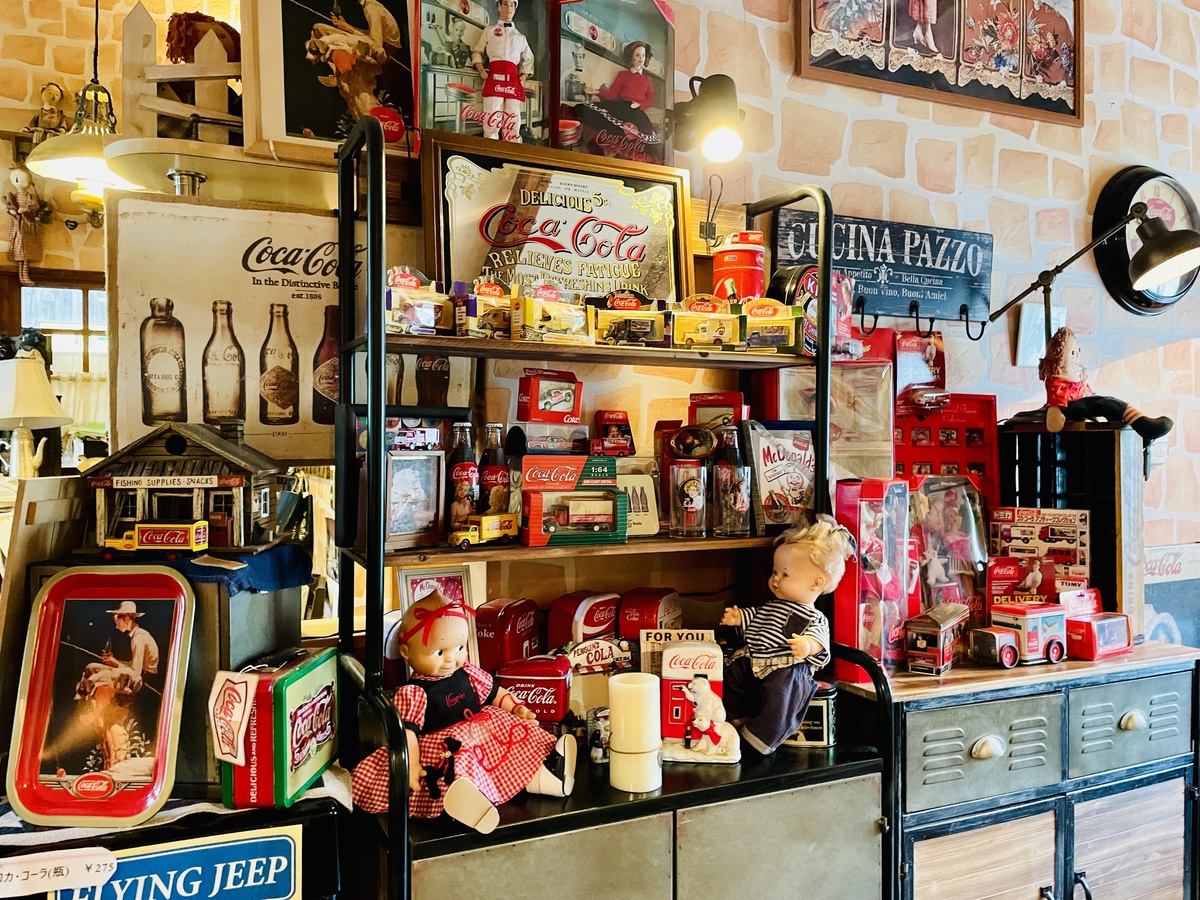 お母さんが集めてきた、コカコーラグッズや年代物のバービー人形たち。