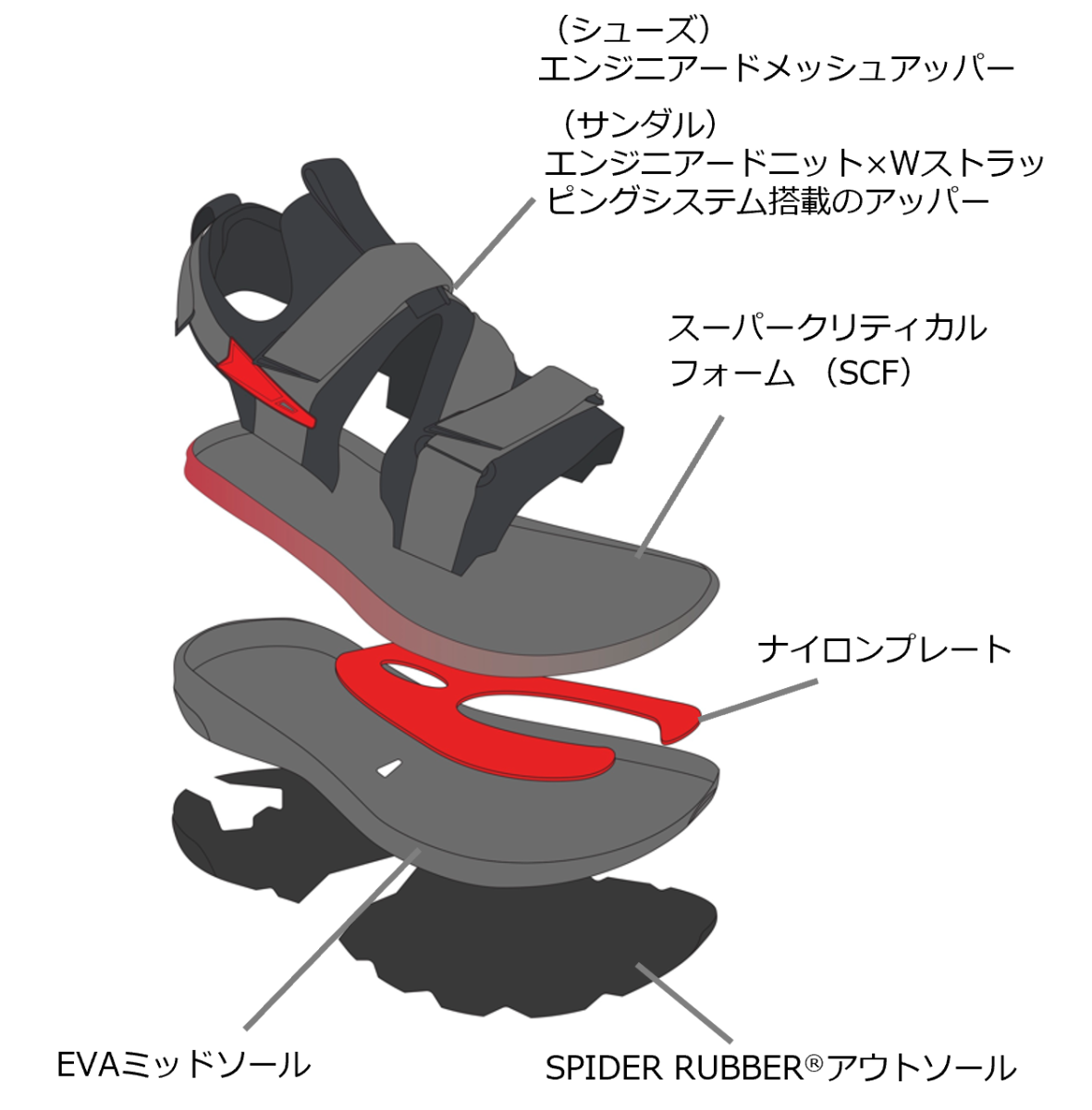 さらに、内蔵されたナイロンプレートがねじれを補正しながら、推進力を安定化。アウトソールにはTevaオリジナルの「SPIDER RUBBER」を使用し、トレイルで抜群のグリップ力を発揮する。
