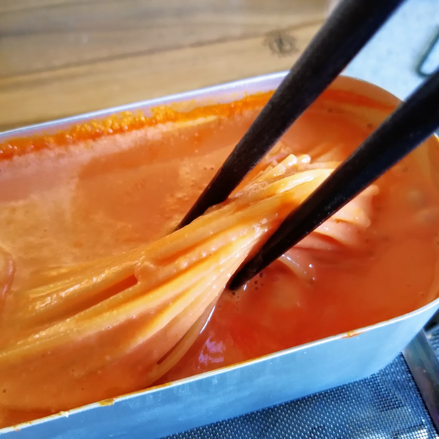 パスタが茹で上がるまでは、メスティンの底に焦げ付くことがないように、たまにかき混ぜてください。