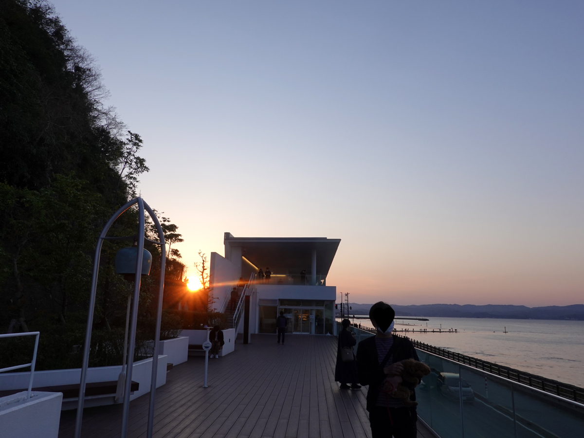 2018年にオープンした「道の駅雨晴」。おしゃれな建物です。建物の隙間から覗く夕陽をゲット!