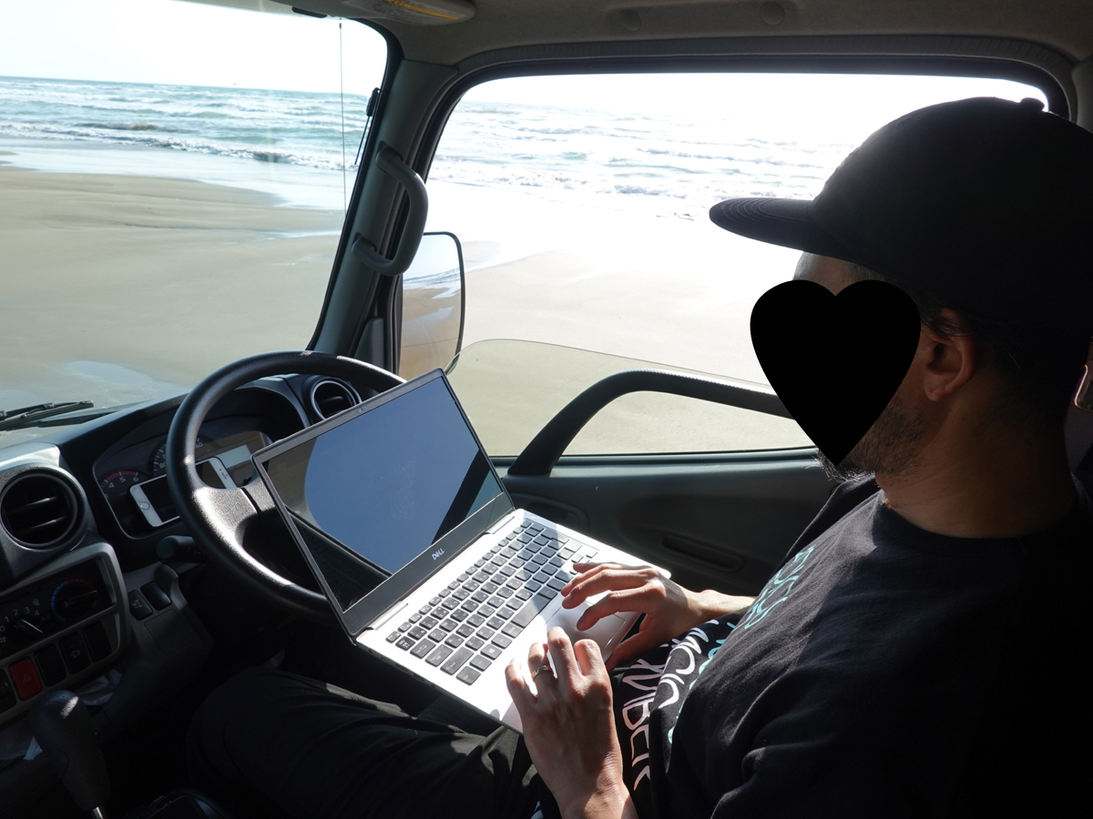 日本海に面した石川県の千里浜にて、波打ち際にキャンピングカーを停めて「チルタイム」。