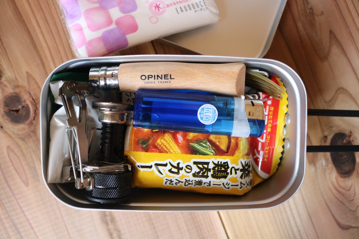 四角い形ゆえに、ストーブとライター、ティッシュやウェットティッシュ、ナイフ、カトラリー、行動食、食後のコーヒーなどが綺麗に収まりました。