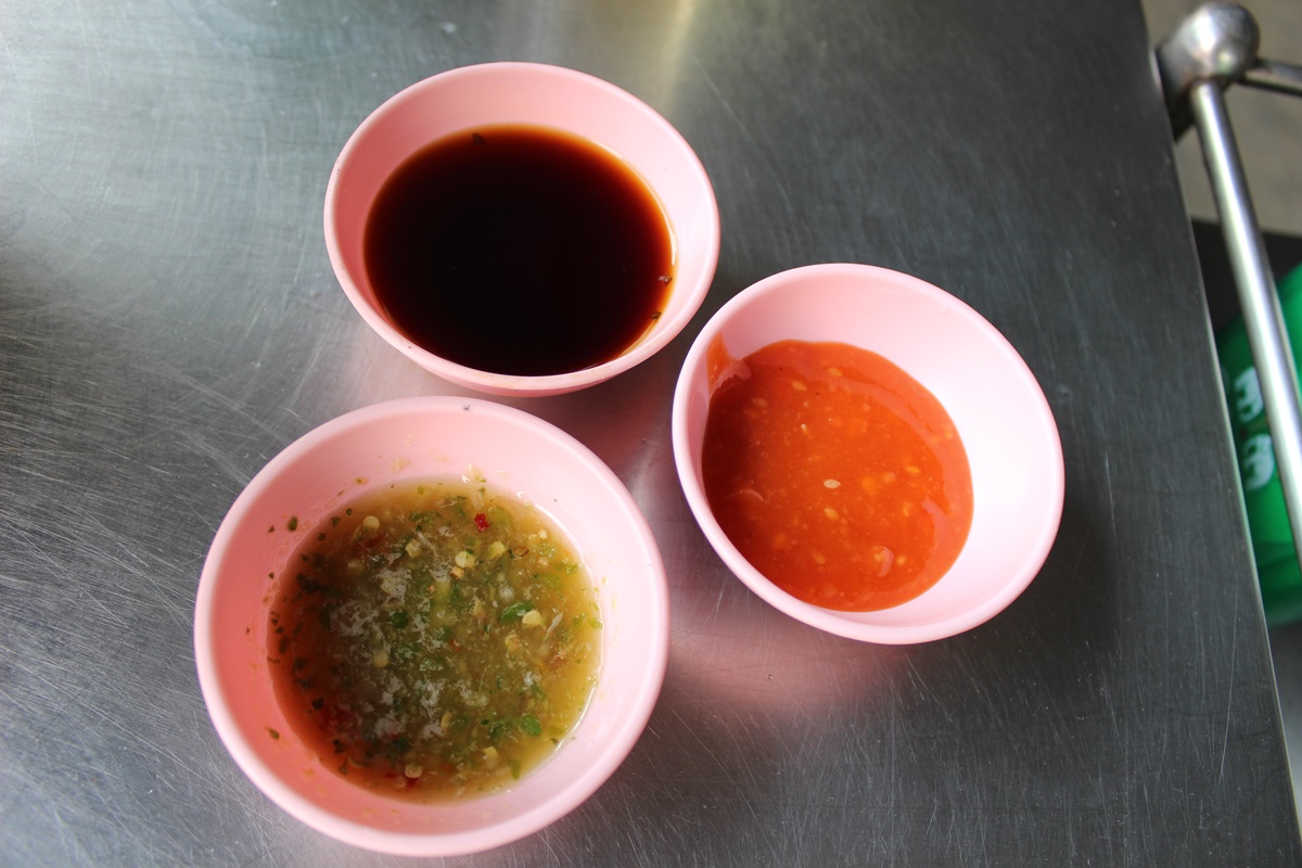 赤いタレは甘辛の「ソースプリック」、緑のタレはシーフードに合う酸っぱ辛い「ナムチムタレー」。 どこのムーガタ店でも「シーユー(しょうゆ)をください」と店員さんに頼めばもらえる。