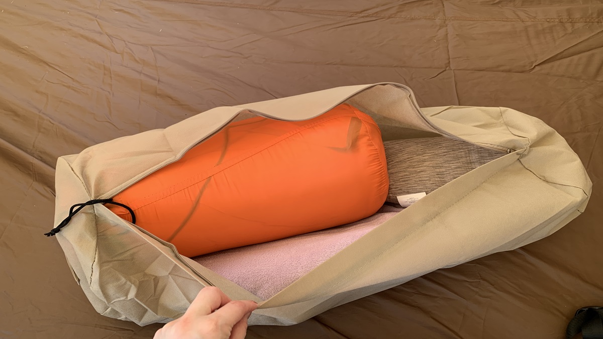 毛布やブランケットなどは厚みによっても収納枚数が変わりますが、2~3枚は入れられるので予備の防寒具入れにちょうどいいサイズ感だと思いました。