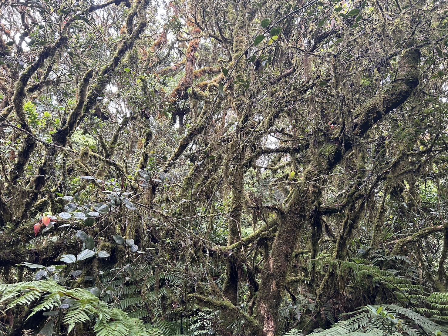 熱帯地域の高地で見られるモッシーフォレストの中を進む。湿度が非常に高く、涼しい気候が特徴で、苔に覆われた幻想的な風景が広がる森林エコシステムだ。