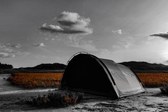 今回リリースされたDPテントでベースとなっているのは、ミニマルワークスで大人気のテント「パプリカ」。組み立てと解体が簡単にできるシンプル設計で、両サイドに設けられドアーが開放感満点の大サイズなのも特徴。DPテントでもダブルウォールを採用しており、さらに機能性と耐久性を維持しながら軽量化されている。