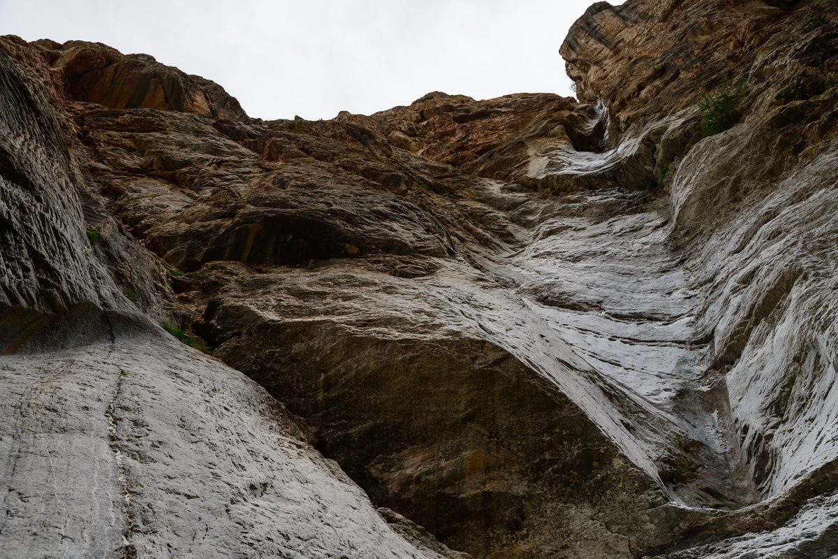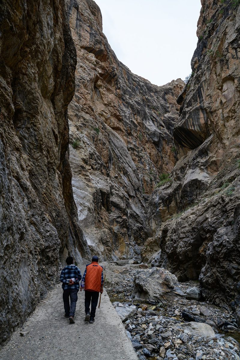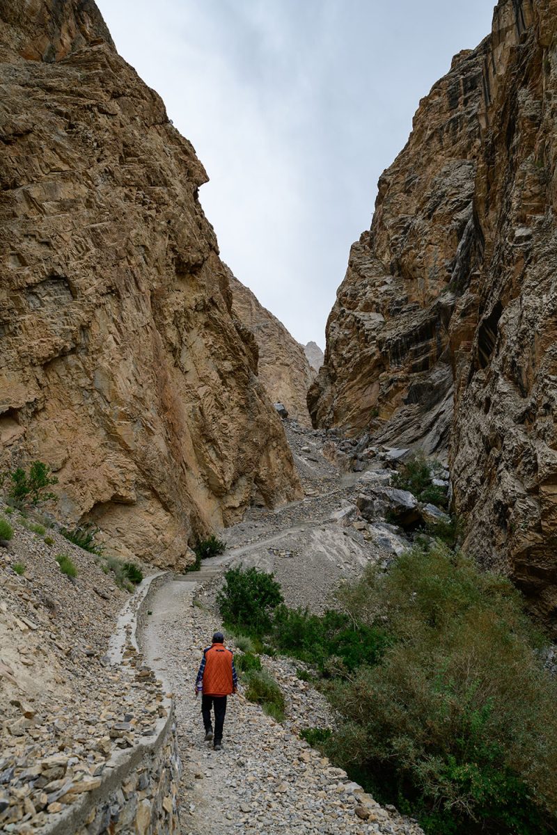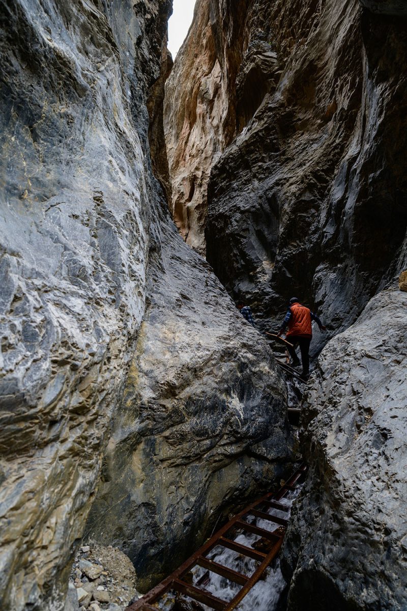 左右にそそり立つ断崖と断崖の間隔は、ますます狭くなっていきます。この場所をよく知っているタシさんに案内してもらっていなければ、一人だと不安になって引き返したくなるレベル。タシさんとスタンジンさんは、まったく平然としたそぶりで、先へ先へと歩いていくのですが。地元出身の人たちの度胸はすごい……。