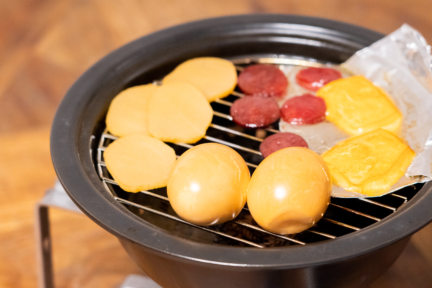 一方、ソロキャンプや少人数でのアウトドアでは、小型の燻製器が便利です。卓上で、食べたい分だけ気軽に燻製にできて、ひと味違った食材の美味しさが味わえます。