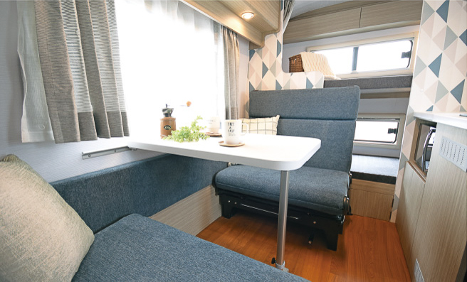 最後部に常設の2段ベッド、中央にリビングとキッチン、前方にはフロントシート上部にバンクベッドという定番のレイアウトを採用し、カップルでもファミリーでも使いやすいような設計です。