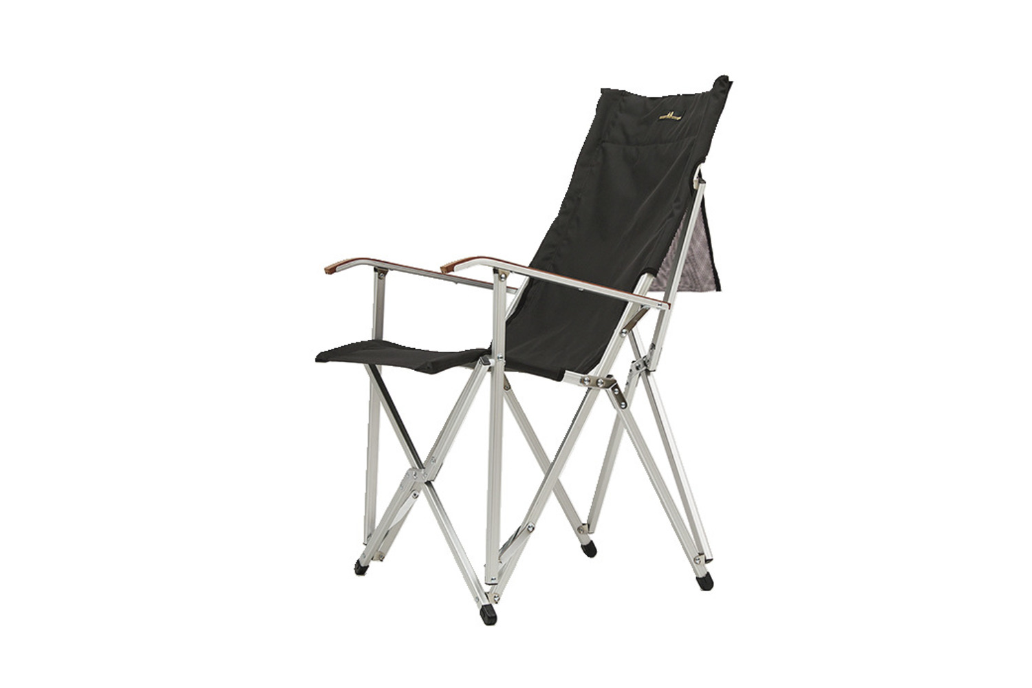 ひじ掛けのセット位置を変えることで、3段階にリクライニングする。収納したときに自立するのって、サイト撤収時などに意外と便利。
