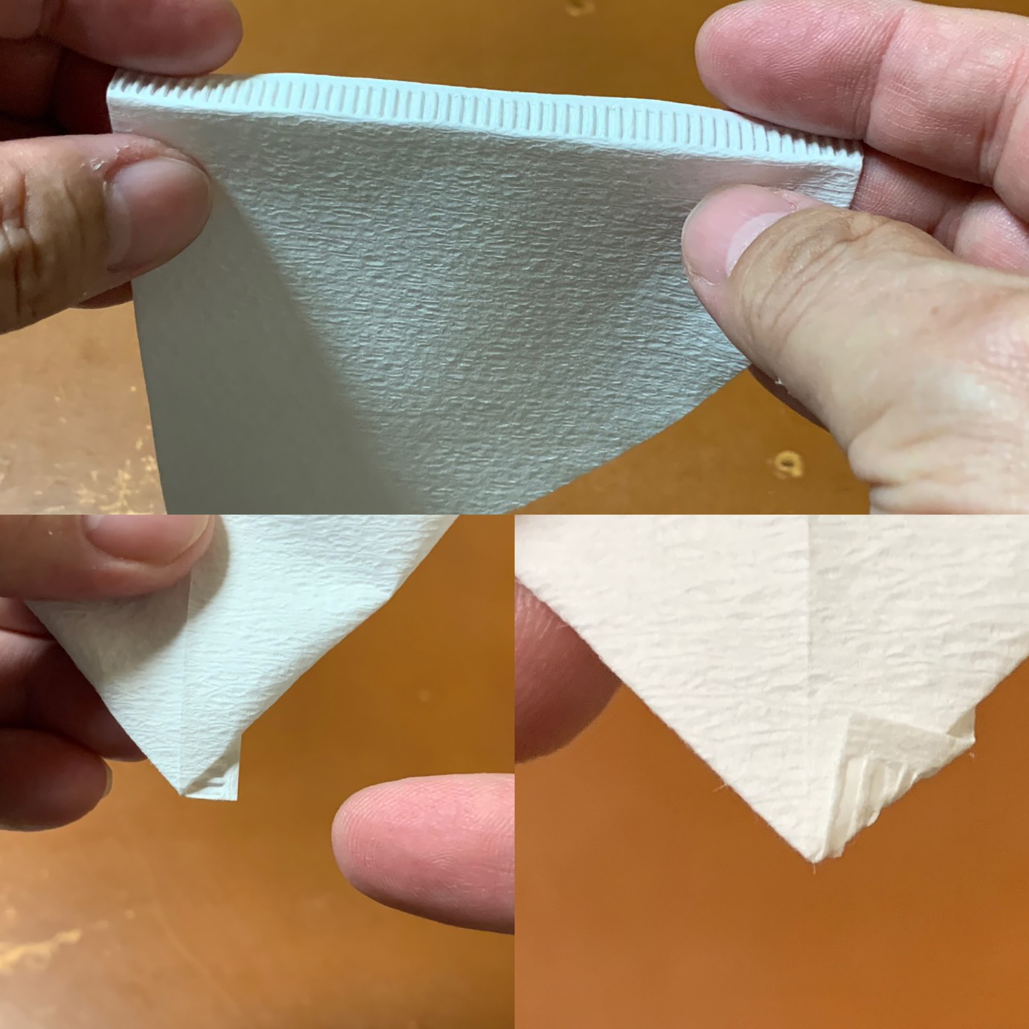 台形のペーパーは2箇所を折って使います。一辺を折ると先端がチョビっとはみ出るので、それをもう1回反対側に折ってください。この折り返しがあることで、ドリッパーにペーパーがフィットし、安定したコーヒーを抽出できます。参考にしてみてください。