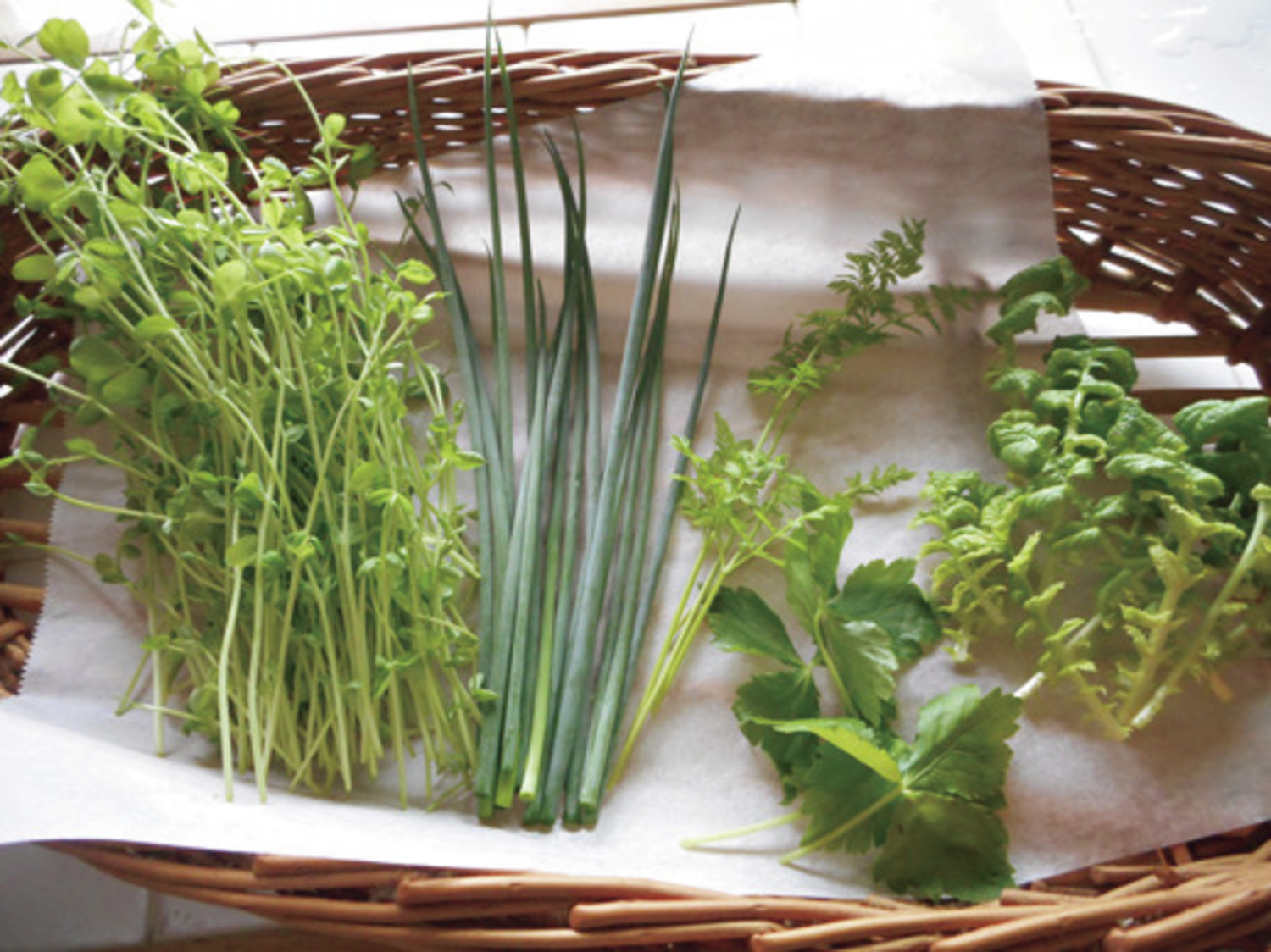 根が少し残っている小ネギやミツバ、セリなどが向く。茎を少し残して切り、根が水に浸かるように容器に入れる。根が十分育ち、残った茎が伸びて新しい芽が出てきたら、輪ゴムで縛ったまま土に植え替える。