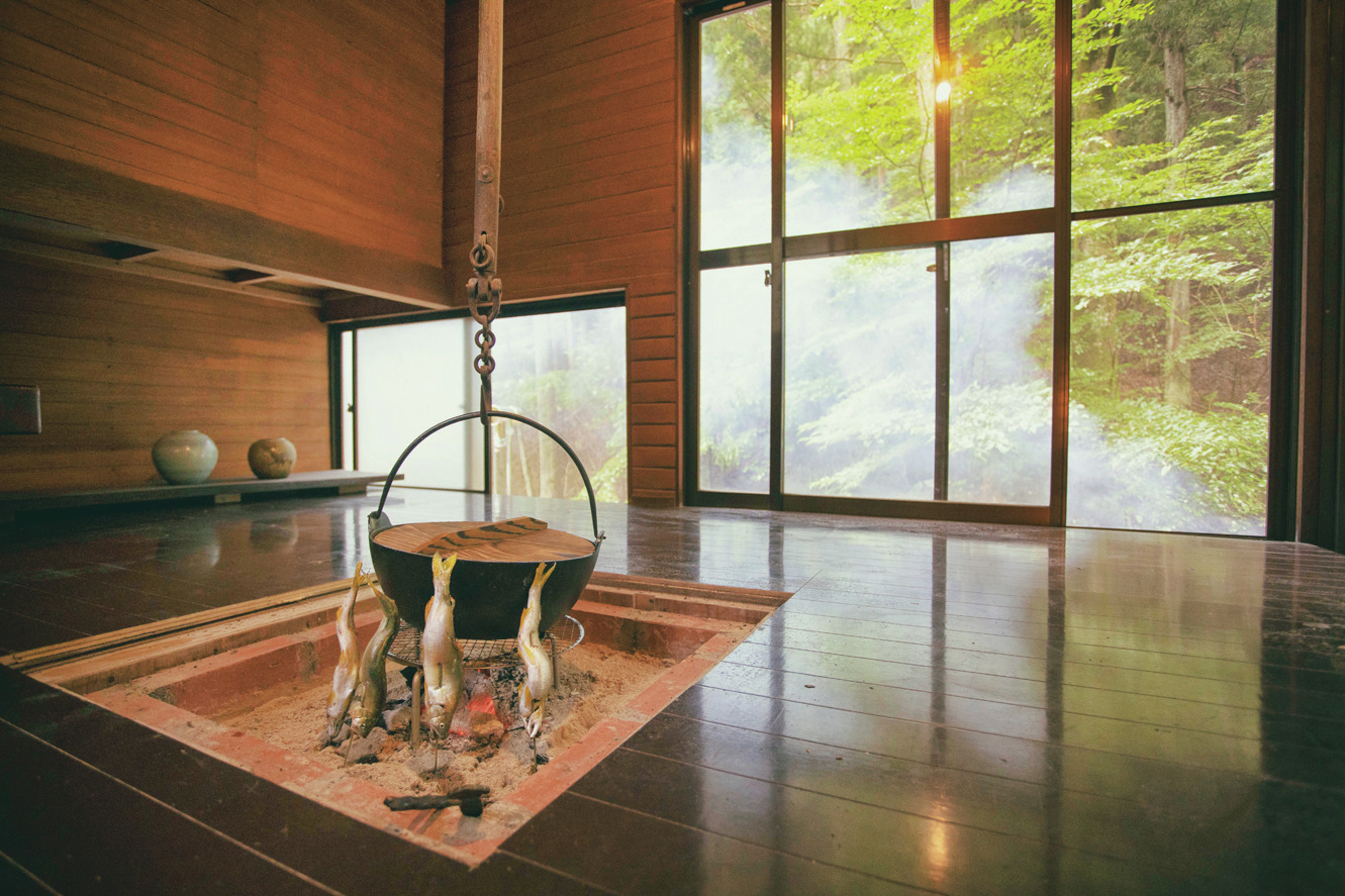 離れにDIYで囲炉裏を追加。川を眺めつつ鮎の塩焼きや焼きおにぎりを食べると最高!