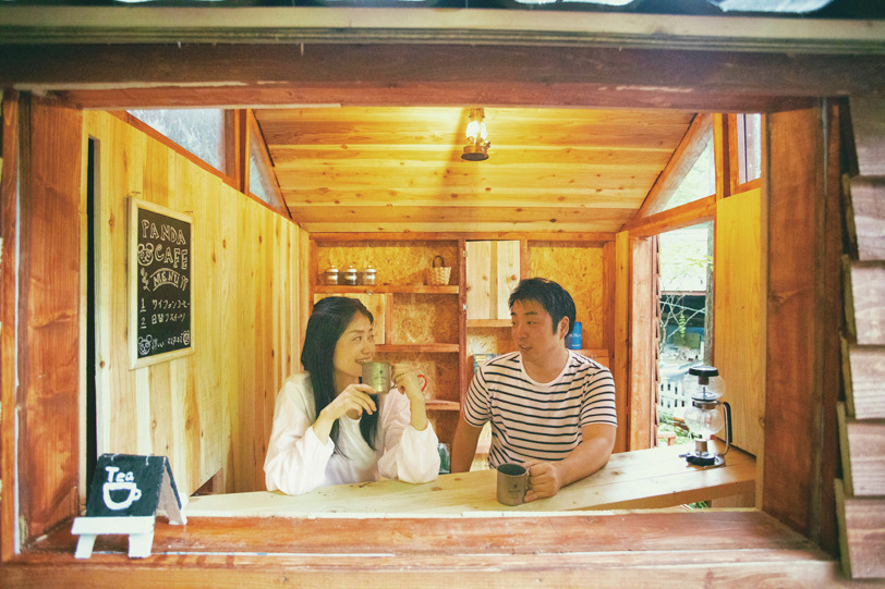 ボードの店名は、熊似の祥人さん+猫好きのゆかりさんで「パンダ(熊猫)カフェ」。実際に営業しているわけではないが、カフェのような居心地良い空間にしたいと、この名に。