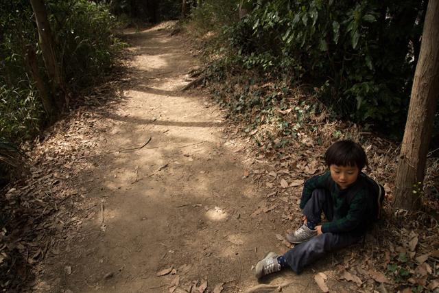山道に入ってからも、軽快な足取りは変わらず。比較的平坦なところはダッシュで駆け抜けていく。ハイキングのはずなのに、これじゃトレイルランニングだ。道中を急ぐ必要なんてないのだし、周囲の風景にも目を向けて欲しくて、ときどき「あ、切り株があるよ!」、「お花、きれいだね!」と声をかける。それでようやくスピードダウン。切り株を見つければわざわざ乗り越え、ときどき小枝を拾い、傾いた状態の木の根を叩いてどんな音がするかを試す。