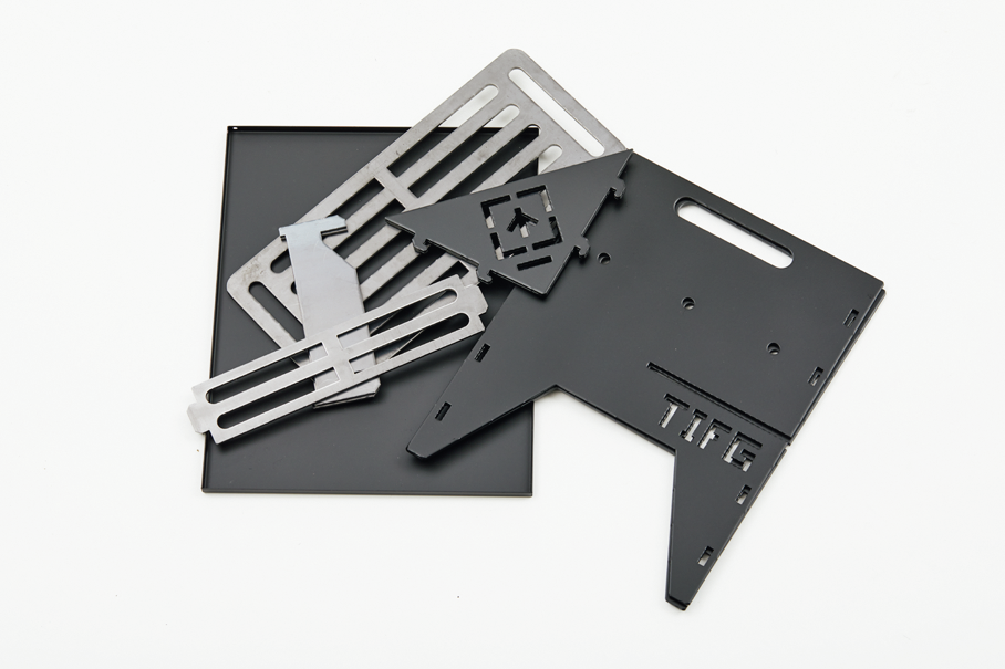 3枚のプレートと火床で構成するシンプルな焚き火台。写真のX字状ゴトクL(¥6,000)は別売り。ほかにS、Mサイズもある。