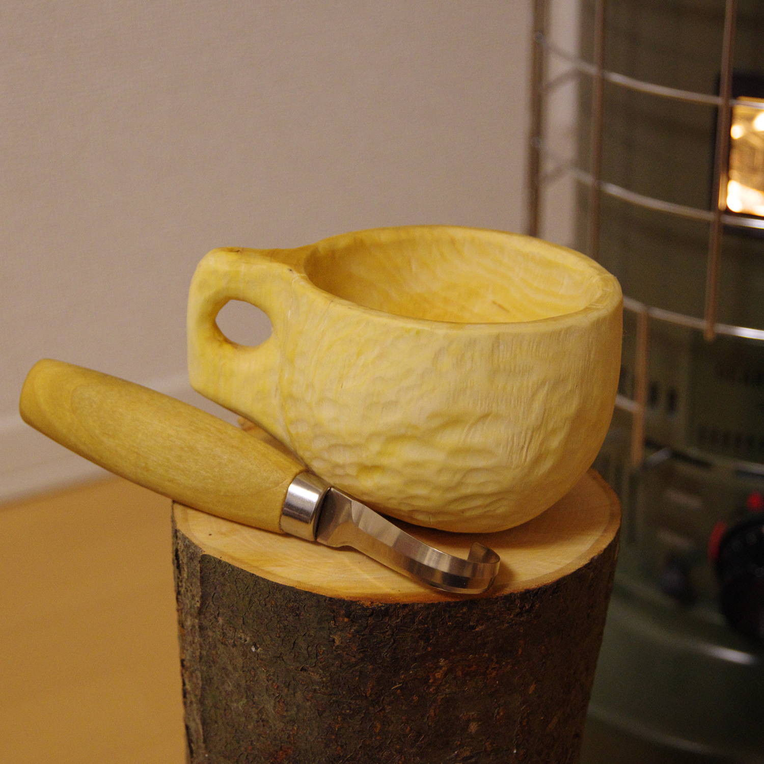 フックナイフを使って外側を削っている最中、乾燥によってククサにヒビが入りました。しっかり乾燥した木材を使わないと、このようにヒビが入る可能性があります。