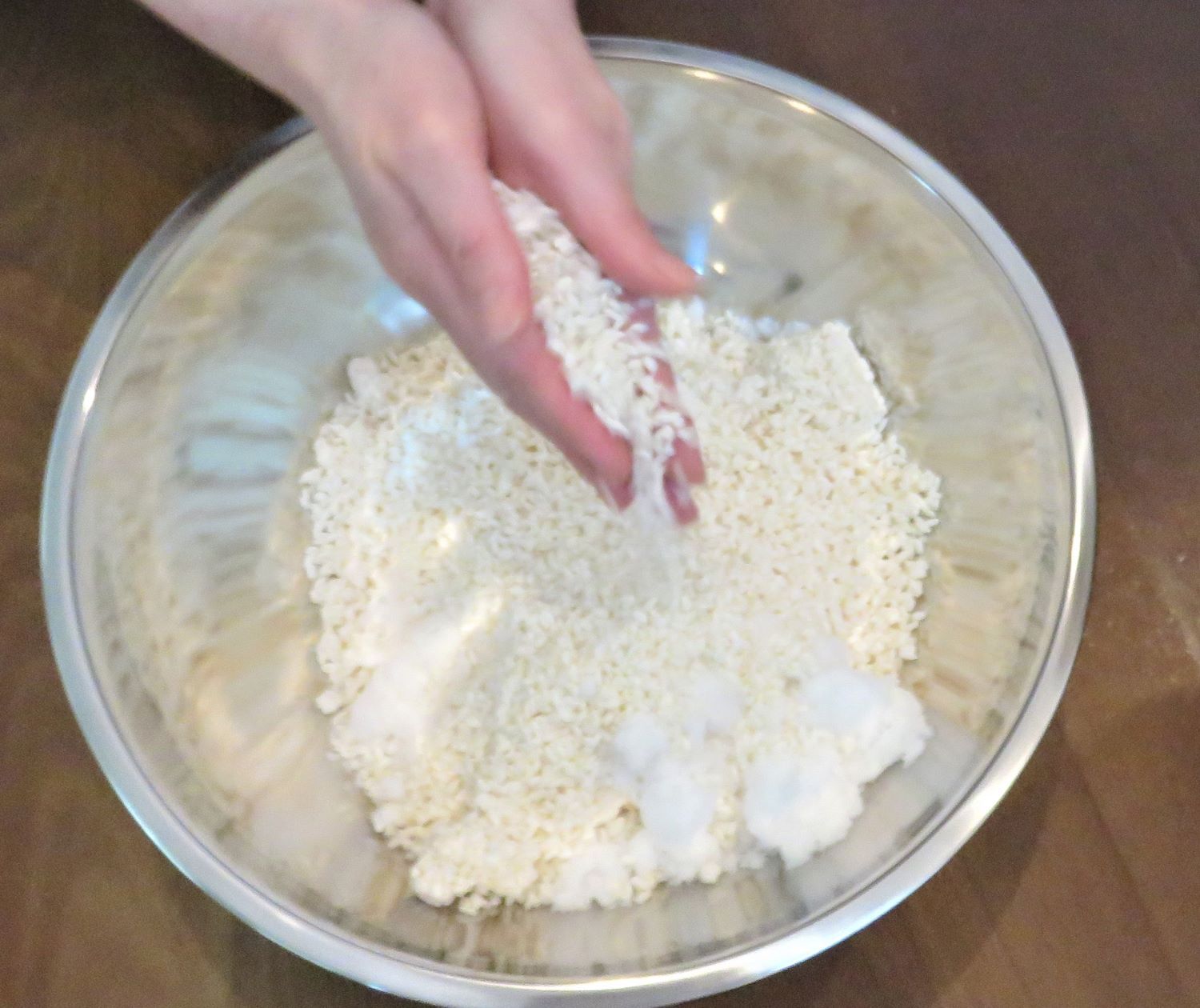 塩大さじ2杯分を仕上げ用にとりわけておき、大きめのボウルに残りの塩と麹を入れ、手でほぐします。麹のかたまりが感じられなくなるくらいバラバラにほぐすことで、次の工程で、大豆と合わせやすくなります。