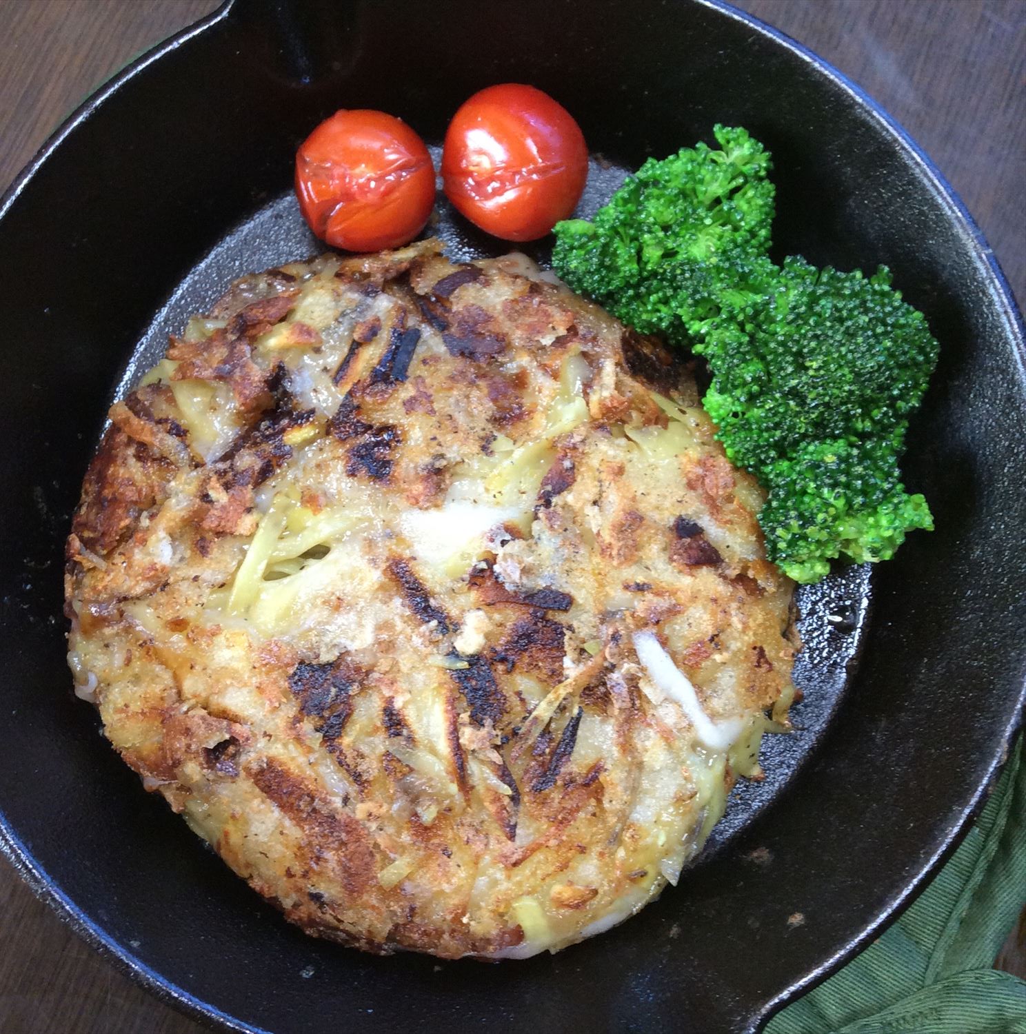 スキレットのまま召し上がってください。餅の表面はカリカリ、内側はもっちりとした感触を味わうことができます。ジャガイモもフライドポテトのようにカリカリになっており、控えめな粉チーズの風味が食欲をそそります。