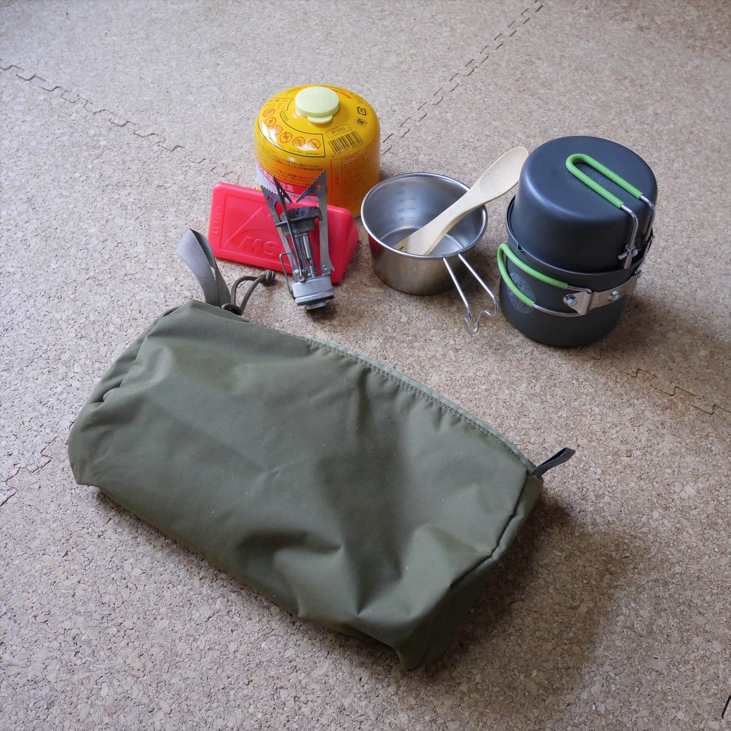 Mサイズにクッカーやバーナーなどの調理器具を入れてみます。
