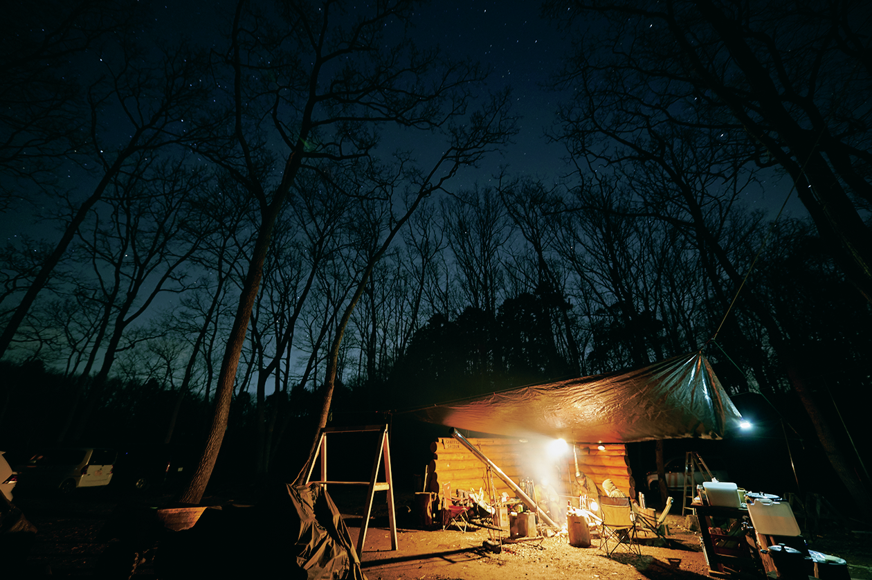 平日はサラリーマンをしている斉藤勇介さんが、広葉樹の森を1年半かけてコツコツと開拓し、2020年2月に営業をスタート。場内にある豊富な木材を使ってブッシュクラフトを楽しめるのが最大の特徴だ。「複雑化し閉塞感を感じる社会に生きる現代人にとって、原点に戻る意味で焚き火は必要だと思うんです。みんなに癒やされてほしい。まぁ、僕が焚き火中毒というだけですけど(笑)」と、斉藤さん。設備はトイレと手洗い場のみで、インフラを整えたいとの思いは強いが、「不便を楽しめる場所は貴重だから、このままで」や、「雨の日のぬかるみにも誰も文句をいわないし、むしろ楽しんでいる」と、今のままの環境を望む常連さんは多い。そんな彼らをつなぐのが、共有の「キャンパーズサロン」。飲み物や食事を楽しむ様子は親族の集いのよう。ウエルカムな雰囲気で、初めてでも溶け込みやすい。