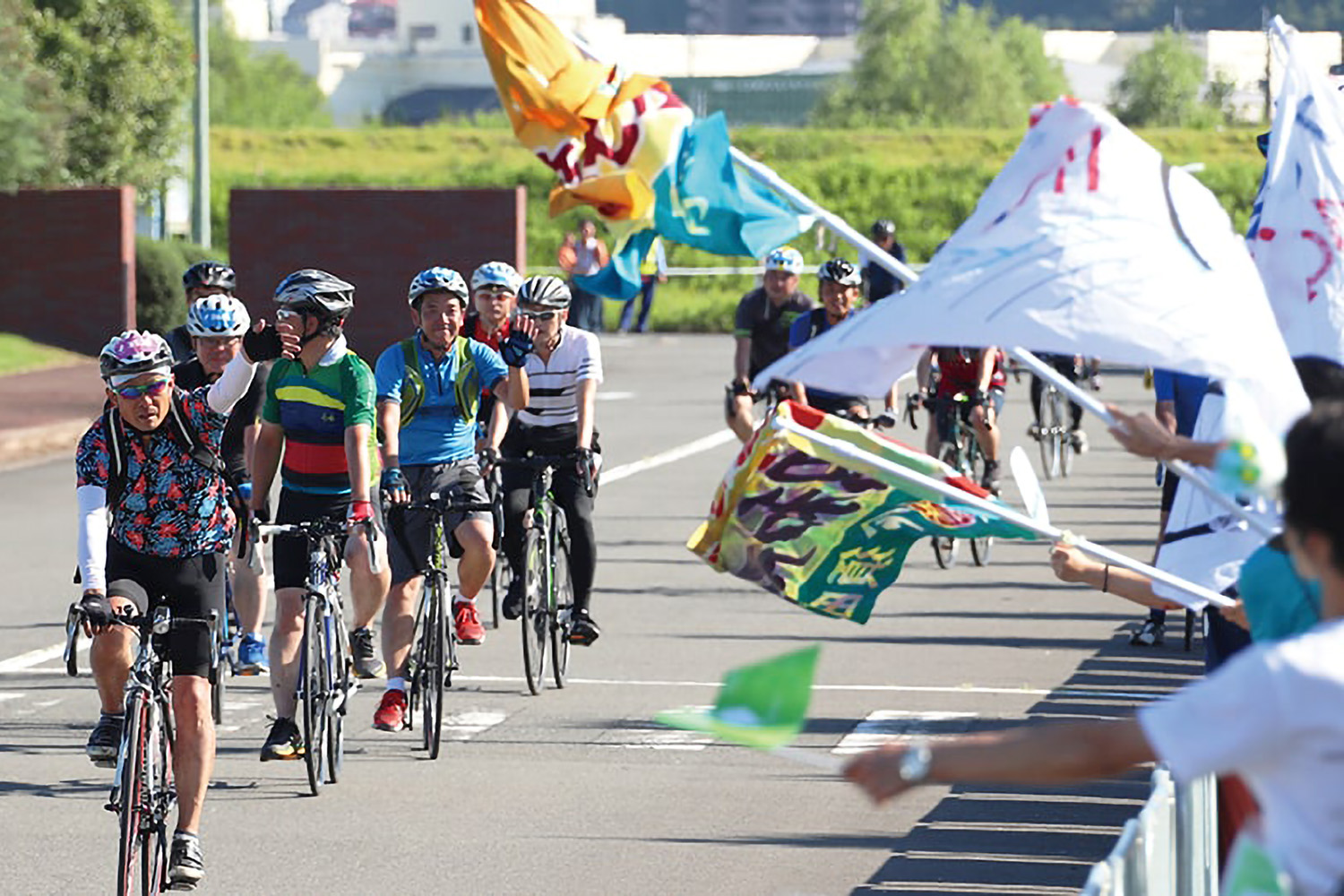 「ツール・ド・東北」は、着順やタイムを競うロードレースではなく、参加者が自分のペースで決められたコースを自転車で走るファンライド・イベント。復興が進む東北の町を自転車に乗って走ることで、未来に向かって歩む東北の「今」を体感できる。コース途中には、その土地の名物料理をふるまうエイドステーションが設置されていたり、名勝が組み込まれていたり。復興されて間もない新しい街の様子に触れることもできる。