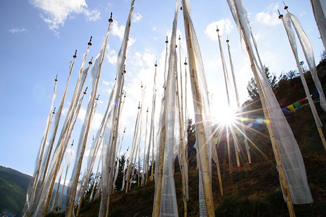 パロの郊外を歩いていると、無数の柱に結え付けられた白い旗がたなびいている場所がありました。この白い旗は「ダルシン」と呼ばれるもの。旗には経文が印刷されています。ブータンでは誰かが亡くなると、その供養のために108本のダルシンを立てるという風習があります。