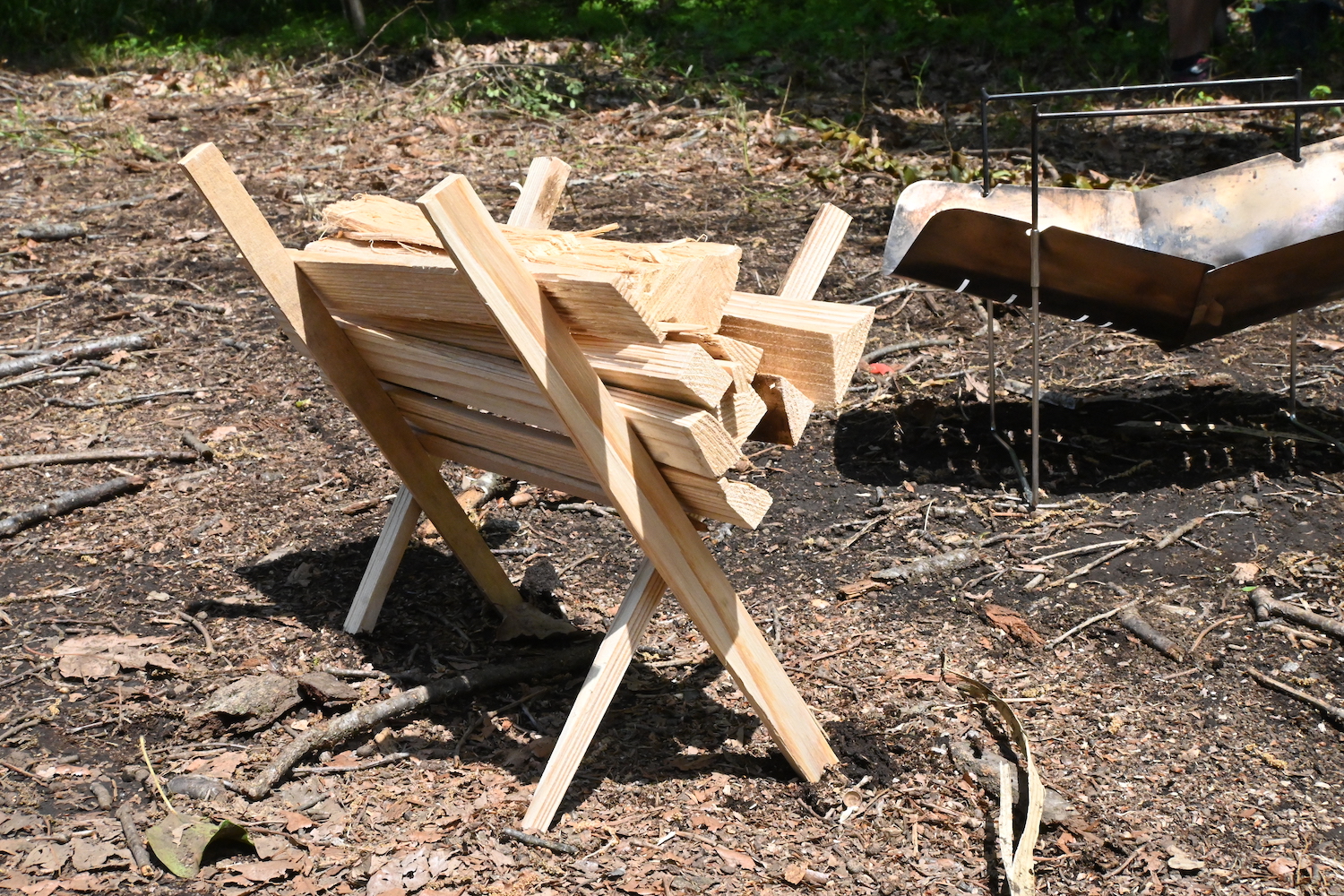 この薪置きの唯一のポイントは、ペグの交差地点を地面から離れた場所にすることです。この高さが薪を地面の湿気から守ってくれます。このポイントを抑えれば、あとは自分が使いたい薪の長さよりも短い幅でもう1セットペグをX字に打ち込めば完成です。