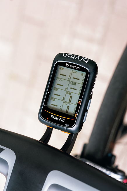 サイクルコンピューターと連動するパワーメーター。力の入れ具合(抵抗)を、ワットで知ることができる。