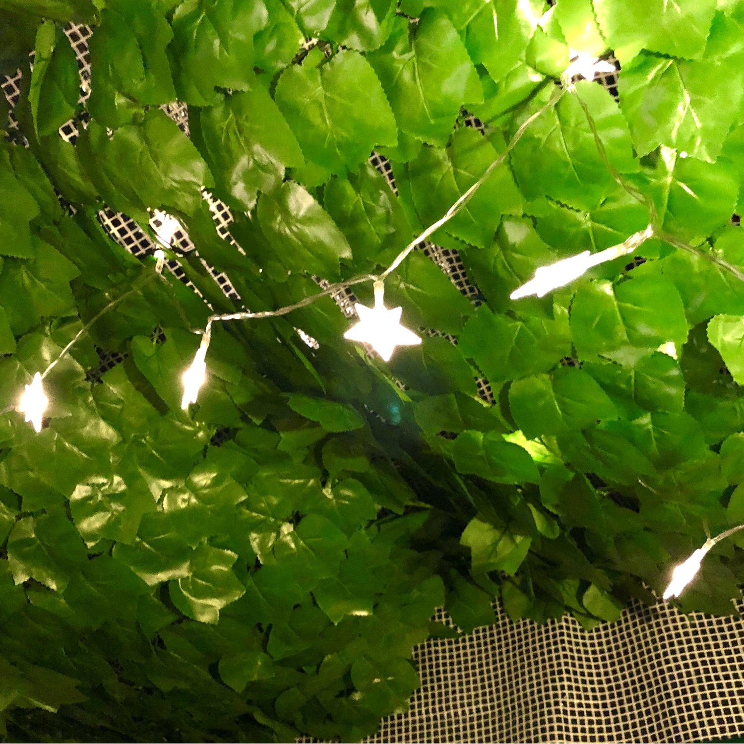 このテントは糸入りの半透明タイプにつき、夜空の星を眺めることができません。そこで、葉っぱに星型のLEDライトを絡め、疑似星空を演出することにしました。