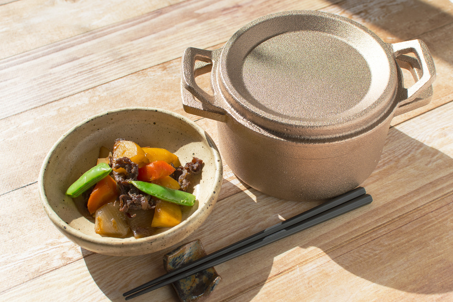 鋳物製のため、鍋が分厚く重いのも特徴の一つ。「tefu-tefu てふてふ」は底面の厚さが4.0mmで、抜群の蓄熱性や保温力を発揮してくれる。鍋の温度を均一保ったまま弱火でも素早く熱を伝え、余分な水分を出さずにまんべんなく素材の中まで火を通すことができる。