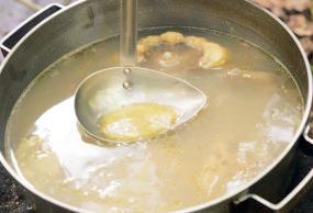 ②再び水を張ったダッチオーブンに牛テール肉を入れ、ネギの青い部分とスライスしたショウガ、潰したニンニクを入れて焚き火の上に。時折チェックし、水分が少なければ足しながら2〜3時間煮込む。