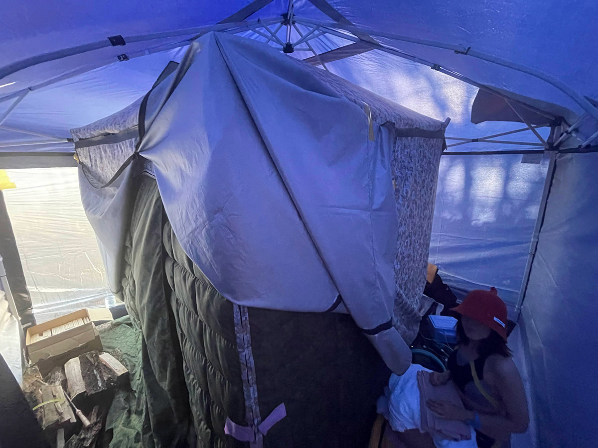 「もともとは、山梨サ活倶楽部はサウナ活動を『サウナイキタイ』に書いたりする活動をしていましたが、テントサウナのイベントで自作のテントサウナを見たのがきっかけで、自分たちでもできるかな、と。ふだんは普通の会社員なので、ちょびちょびと制作を進めて、半年くらいで仕上げました。仕組みとしては、外側は通常のキャンプ用ワンタッチタープを改造し、断熱材などを加えて何層にもしています。中は、お風呂マットの上にマット類を重ねた“床に座る”スタイルで、薪ストーブはMORZH(モルジュ)と同じ、INTENTストーブを使用しています。これらは完全に分解することができて、ギリギリ自分の車に載せられるくらいに収めています」
