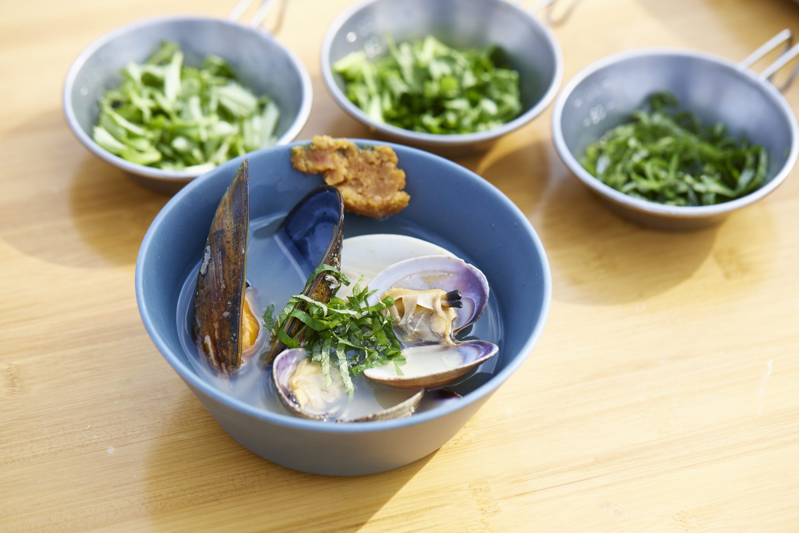 - 鍋に昆布水、日本酒、貝類を入れて火にかける。沸騰したらアクを取り除き、貝の口が開いたら、器に盛り、お好みのみそを加えて好みの薬味をかけて食べる。