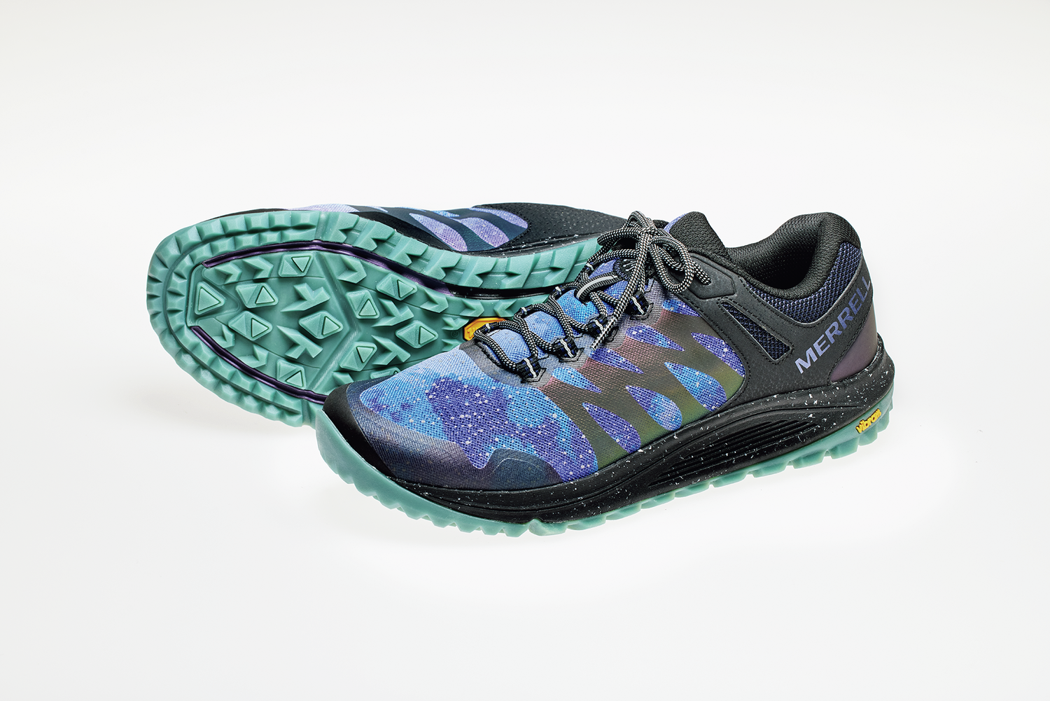 暗いトレイルでもヘッドランプなどの光が当たると星がきらめくようにアッパーが光る、遊び心満点なモデル。夜道を歩くときには安心この上ない。トレランや低山ハイク、街履きまで、幅広い用途に対応する。