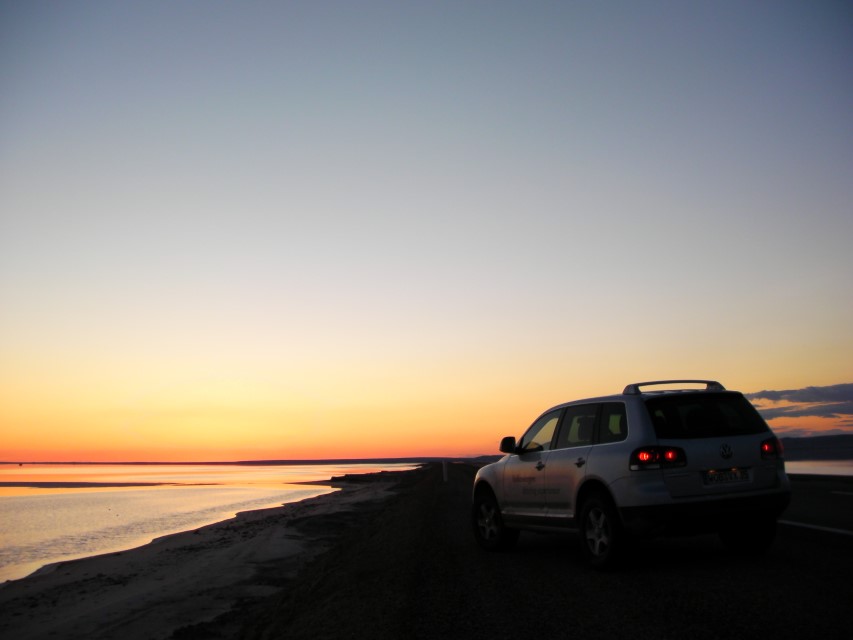 左前方が夕陽を反射し始めてきた。砂漠ではなく、水面だった。アンドレアスがトゥアレグを路肩に寄せて止めた。こちらも停めて、降りた。