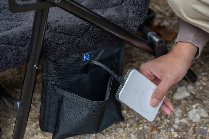 焚き火を眺めたりながらゆらゆらするのは、なんともゴキゲンな時間(話も弾む!)。じつは前脚部分を取りはずすことにより、さらに100gほど軽量化することができる(620g)。これは人気の高い「ヘリノックス」の『チェアワン』(960g)と比べても約340gも軽い。