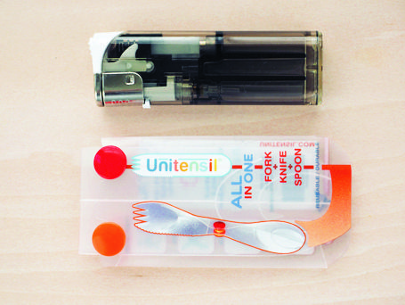 厚さ1㎜のプラスチックプレートを中央部でボタン留めすると、スプーンとフォーク、それにギザ刃のナイフの3ウェイカトラリーになります。