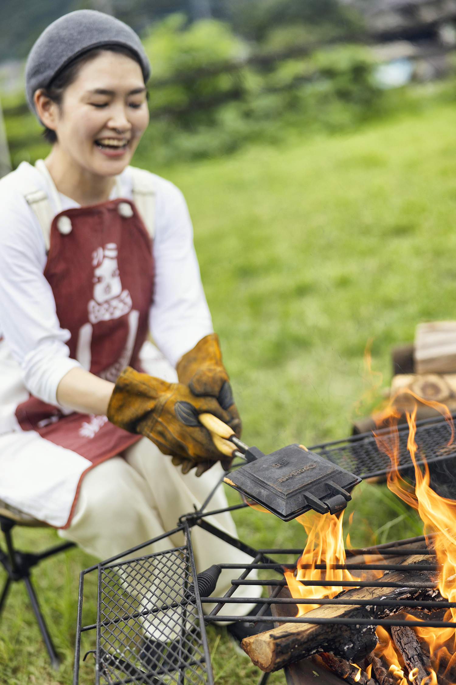 キャンプの朝ごはんに欠かせないホットサンド。焚き火で炙るというアトラクション付きです! サバとのりをチーズが包み込む。遠火でじっくり焼いてね。