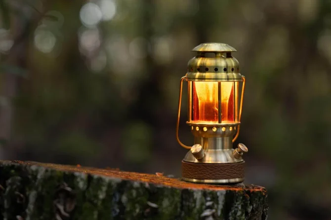 新潟県燕三条のキャンプ用品総合メーカー、ユニフレームのガスランタン。ホヤ部分を本体内部に収納できる構造で、コンパクトかつ安全に持ち運びできる。