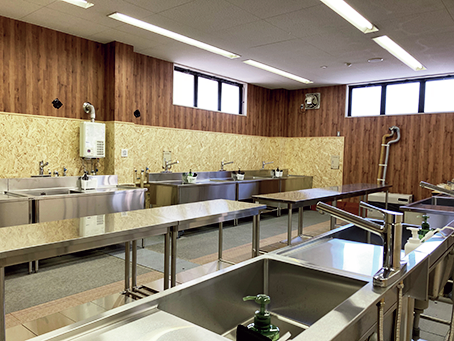 広くて清潔な炊事棟。シンクはピカピカ。温水も使える。