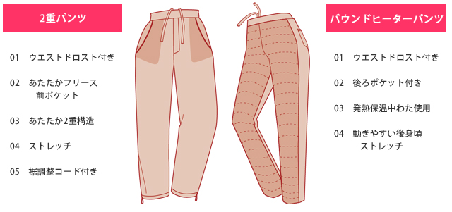 アウトドアパンツはメンズ、レディースともにあったかフリース素材を使用した2重仕立てのパンツと、保温性に優れた中綿素材を使用したバウンドヒーターパンツの2タイプに。2重仕立てパンツは表側に軽量で気密性の高い布帛素材、肌側は暖かでソフトタッチのフリース素材となっている。生地と生地との間にできる空気層により、しっかりと暖かさをキープできるのが特徴だ。