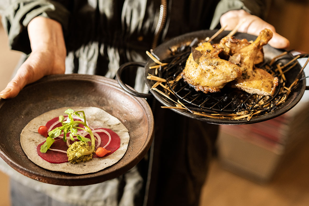 オススメの料理は「ローストサーモンのロイムロヒ風と大根のカルパッチョ」「藁の香りを付けたローストチキンのタコス」「石焼き鹿ステーキグリル野菜」など全7品からなるコース料理「森ノDINNER“薪火とグリル”」(3日前予約)。レストランが位置する森に代々伝わる「山暮らしの知恵」をヒントに、夏に自社農園で取れた野菜をていねいに加工。保存の知恵を生かすことで、冬でも自家製によるひと手間かけた料理を提供することを可能にしている。