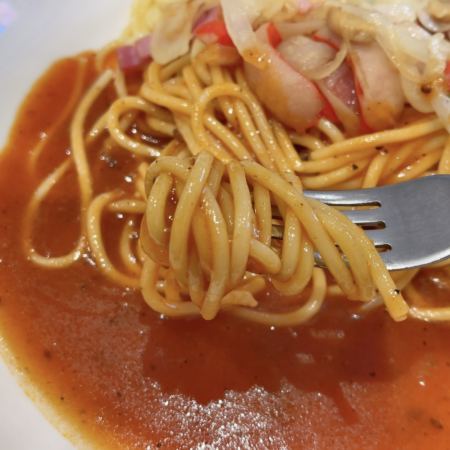 実は私は酸味のあるトマト系のカレーやソースが苦手なのですが、まろやかでコクのあるスープが麺によくからむ!それでいて、どこかスパイシーな風味もあって食べ飽きない。