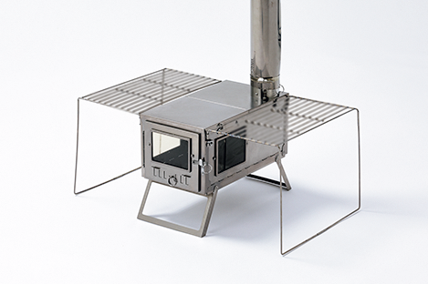 本体から煙突までチタンでできた、わずか1.7㎏の超軽量薪ストーブ。フロントと両サイドに耐熱ガラスの窓を配置し、中の炎の様子が見られて癒やし効果抜群。煙突は1枚状の生地を丸めて使い、コンパクトに収納して持ち運べる。