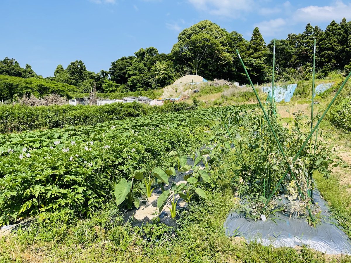 4月に植えた夏野菜は全盛期、サトイモはまだまだ成長途中です。
