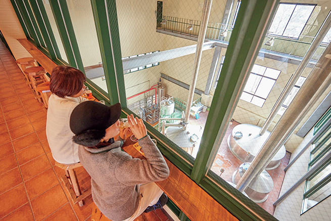 受付はブルワリー3階のタップルーム。フリードリンクチケットが1人1枚もらえる。3階から見える醸造工房では、定期的にブルワリーツアーを開催。