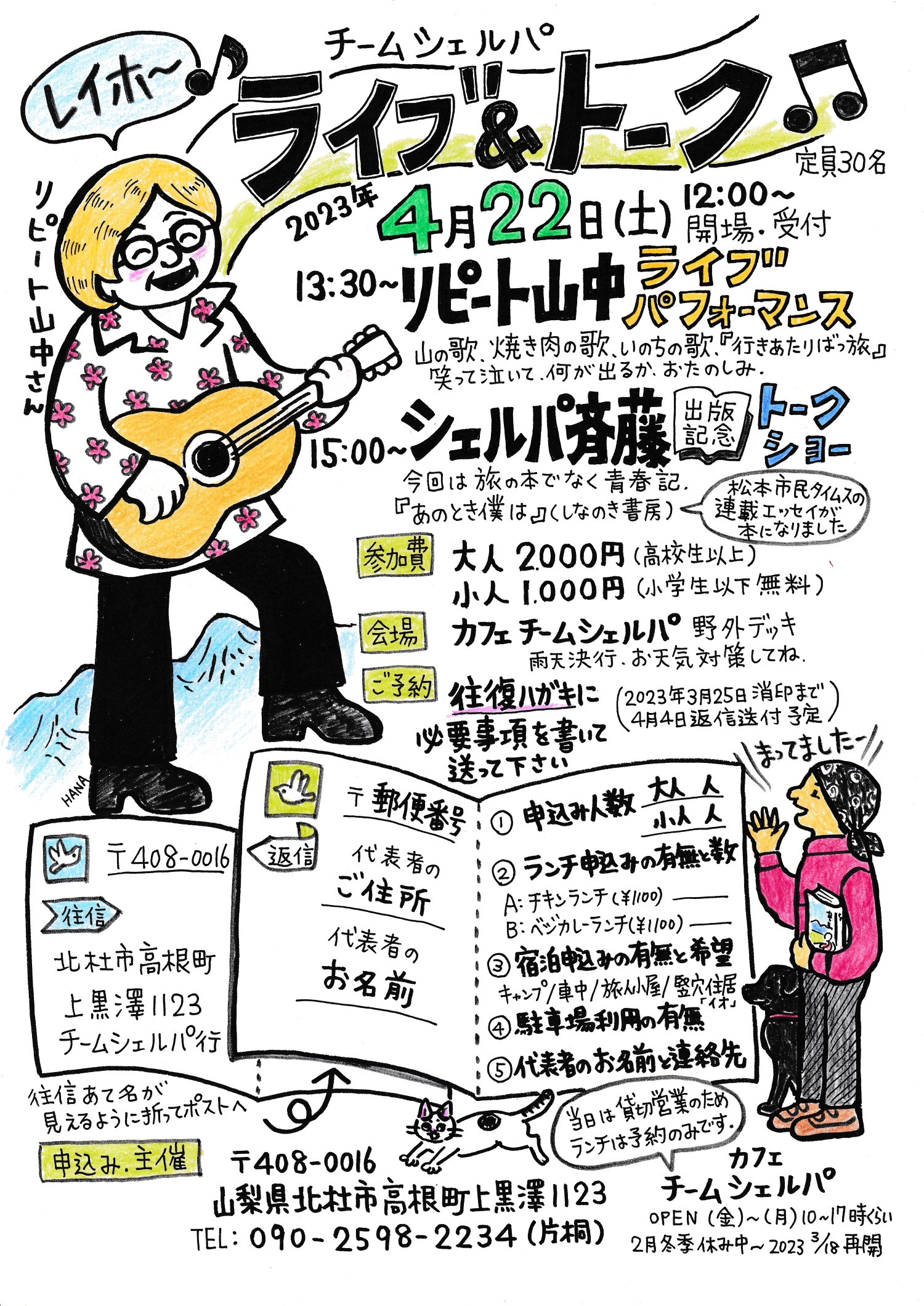 2023年4月22日の土曜日に八ヶ岳山麓のわがカフェ『チームシェルパ』でライブ&トークショーを開催します。新刊『あのとき僕は シェルパ斉藤の青春記』をテーマにした僕のトークステージと、シンガーソングライターのリピート山中さんのライブステージの2本立てです。往復ハガキでの応募に限定していましたが、メールでも予約を受け付けます。下記のチラシを参照に、参加希望者はハガキに記載すべき内容をメールで送ってください。送り先のアドレスは、