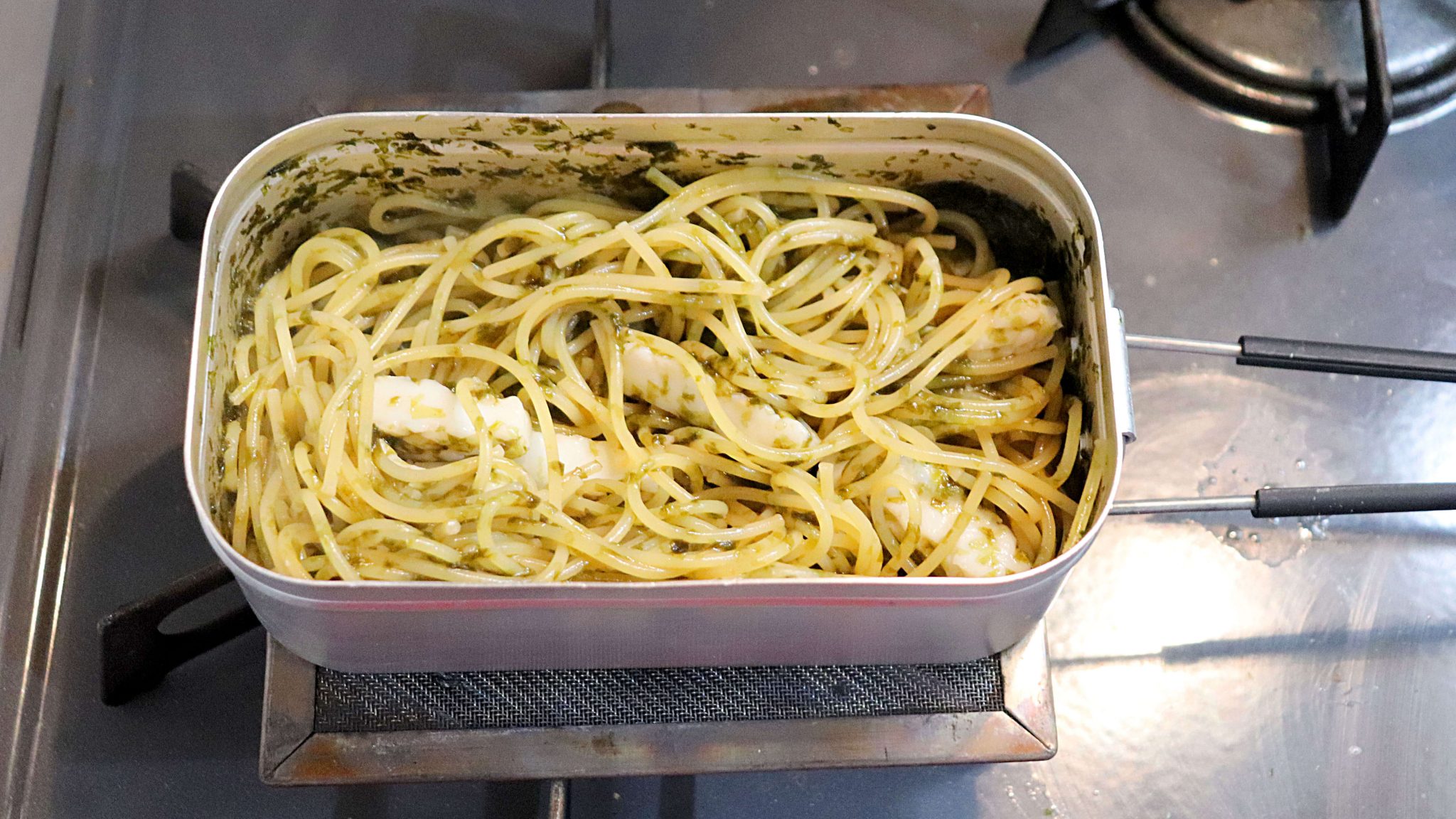 【3】メスティンごとひっくり返し、そのまま中火でじっくり2分ほど焼き、元に戻してフタを開け、全体を混ぜる。